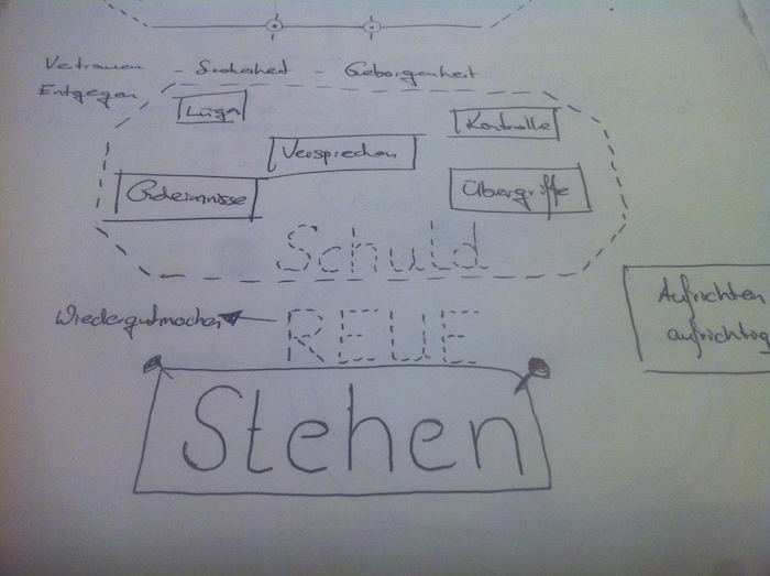 Das war für mich einer der großartigsten Abschnitte der dritten Bewusste-Eltern Staffel. So echte Lebenslügen haben wir so richtig tief verbuddelt, weswegen mir auf Anhieb fast nichts einfiel. Also bat jeder der Workshop-TeilnehmerInnen sein Unterbewusstes um Signale, die uns (natürlich nicht in der Gruppe diskutiert) erlaubten das zu sehen, was zu verstecken uns unglaublich viele Lebensressourcen nimmt.